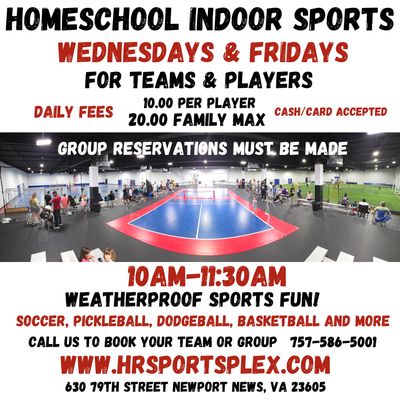 We are pleased to offer Homeschool PE play this Fall. Groups interested need to reserve a date to play ahead of time so we schedule staff. Here is the info: Email to manager@hrsportsplex.com or call 757-586-5001 to book. A minimum of 10 is needed to secure. If you don't have a group and want to play call us the day before to check if you can since reservations should be made at least a week in advance.